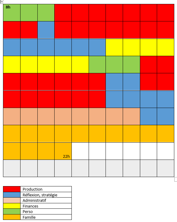 Choisissez des couleurs différentes suivant les thèmes de vos activités : exemple bleu pour production, jaune pour administratif, vert pour perso, etc…